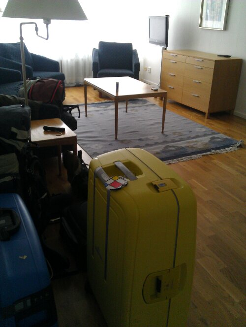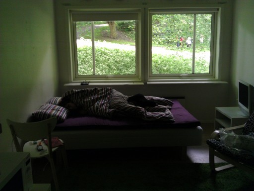 En rentrant hier soir dans note chambre située à plusieurs km de notre salon, nous nous sommes rendus compte que le lit était un lit d’une place et demi et qu’une seule des 2 couettes individuelles fournies, recouvre totalement le lit… Ces appartements sont des appartement fournis pour les ouvriers de Trafikverket. Ils sont supposés être seul et non en couple. Les gens de Trafikverket qui nous ont proposé cet appartement ont dû aller faire rapidement des courses pour satisfaire tant bien que mal les besoins d’un chercheur de KTH… Mais + ‘mal’ que ‘bien’ au final… enfin… Ils ont fait un effort…, mais nous avons eu froid (et oui même collés serrés), nous avons mal dormi : « attention : 1, 2, 3 on se retourne ensemble » , l’appartement est assez crade et même si nous n’avons rien signé, je ne me sens pas de nettoyer, en plus, cet appartement qui à la base est crade…