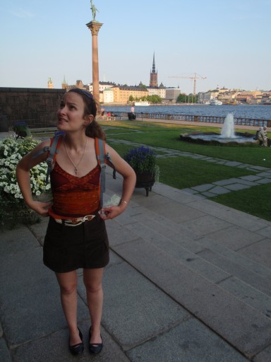 nous avons traversé Riddarholmen, avec son joueur de lyre sous le soleil couchant de la place :