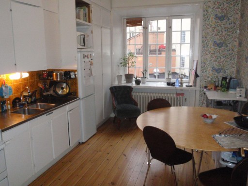 Voici notre cuisine ! Le papier peint n’est pas des plus modernes, mais on est assez satisfait de notre GRANDE cuisine avec parquet et plein de rangements.