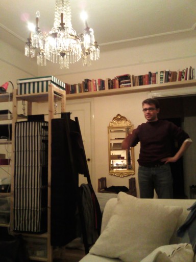 Ainsi donc vous avez pu voir le salon. Dans la photo du jour du 11 oct « la nuit tombe dans notre salon », vous y voyez le canapé et la fenêtre. A droite, se trouvent donc nos bureaux. Les étagères ci-contre, cachent notre lit. Ben oui les suédois vivent sans rideau*, donc nous voulions aussi nous éloigner de la fenêtre qui donne sur la rue et nous isoler à la fois de la lumière et du bruit. (*depuis, il y a un rideau, le rideau noir que ma mÂman avait cousu pour nous à Sceaux !)
