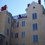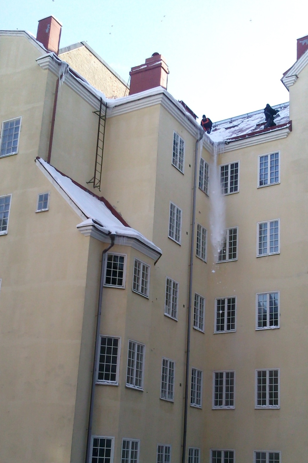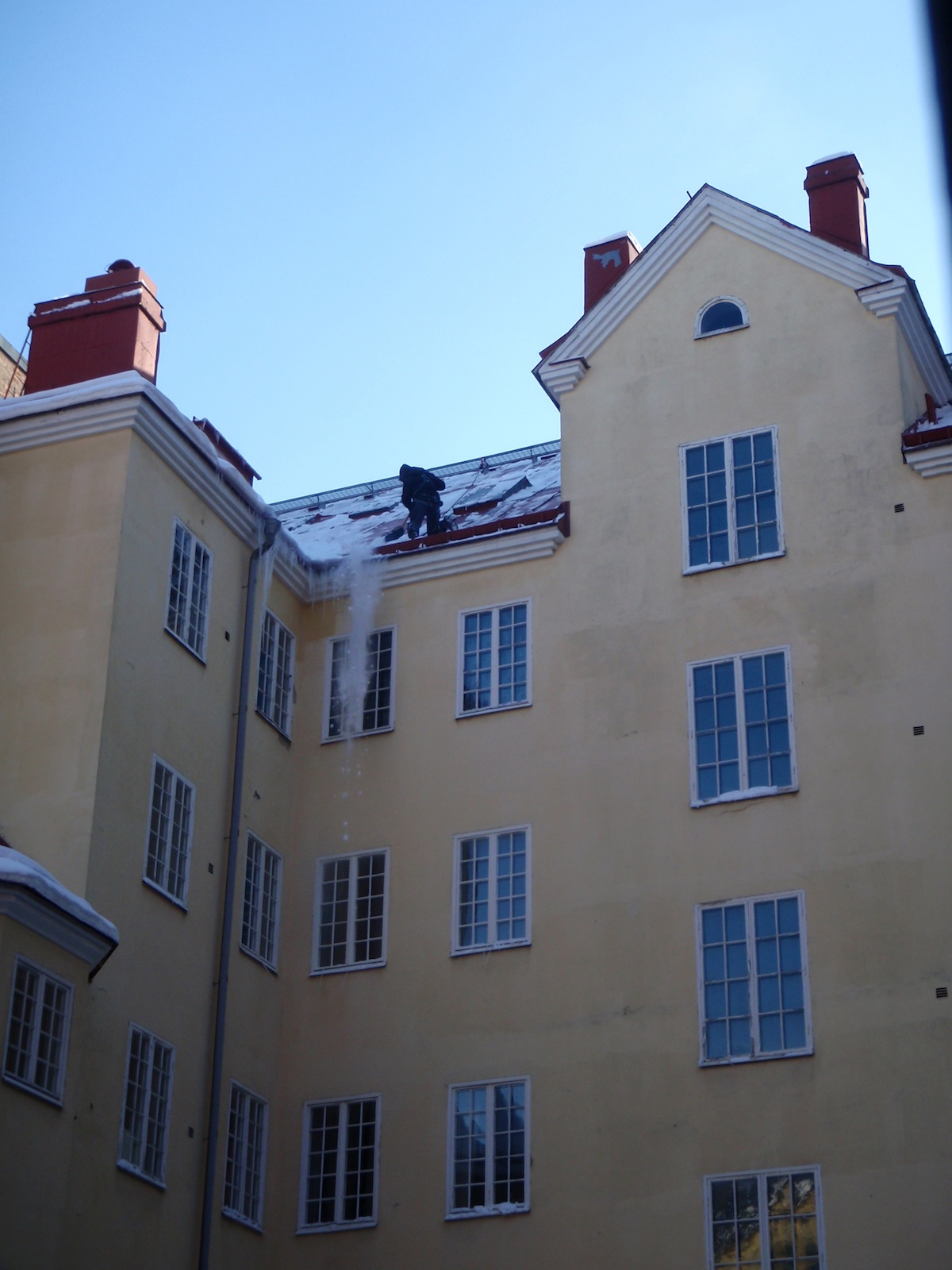 Comme je vous l’avais dit, ici, les suédois enlèvent la neige des toits. J’ai toujours eu du mal à les photographier, surtout parce que je devais les prendre sur leur lieu de travail. Bref, là ils sont en face de ma fenêtre, et j’ai réussi à voler quelques photos… Ils sont en cordée, en général quelqu’un est également en dessous pour assurer la sécurité des piétons, et pour informer ses collègues en sifflant qu’ils ont ou non la possibilité de jeter les énormes tas de neige depuis les toits.