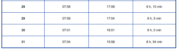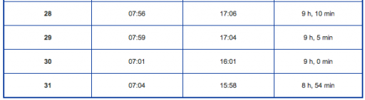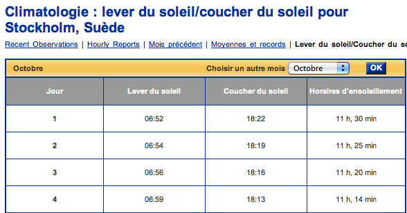 En un mois, nous allons perdre 2h30 d’ensoleillement !! (contre 1h30 en France…) Et avec le passage à l’heure d’hiver le 30 octobre, le soleil se couchera à 16h…