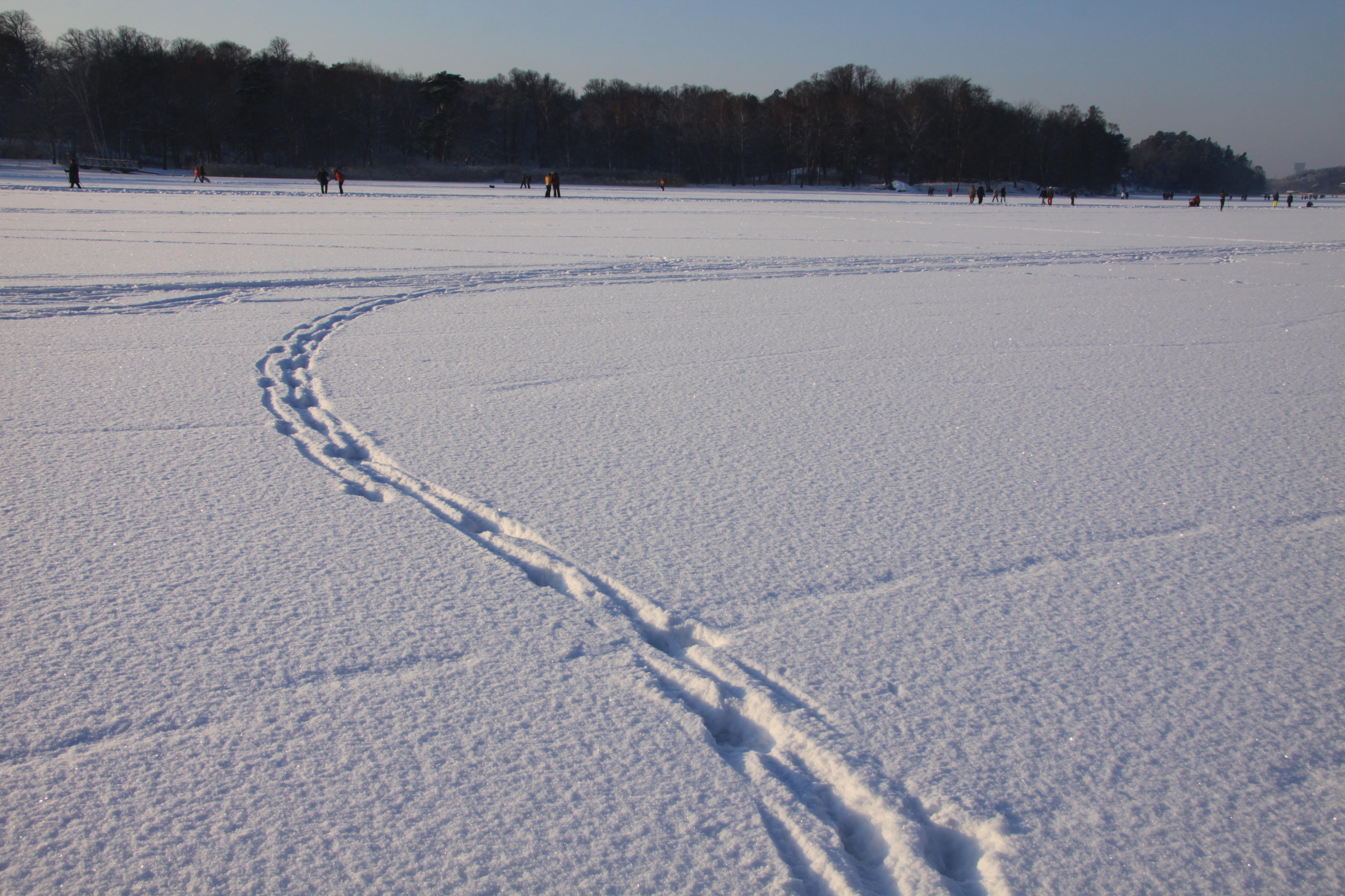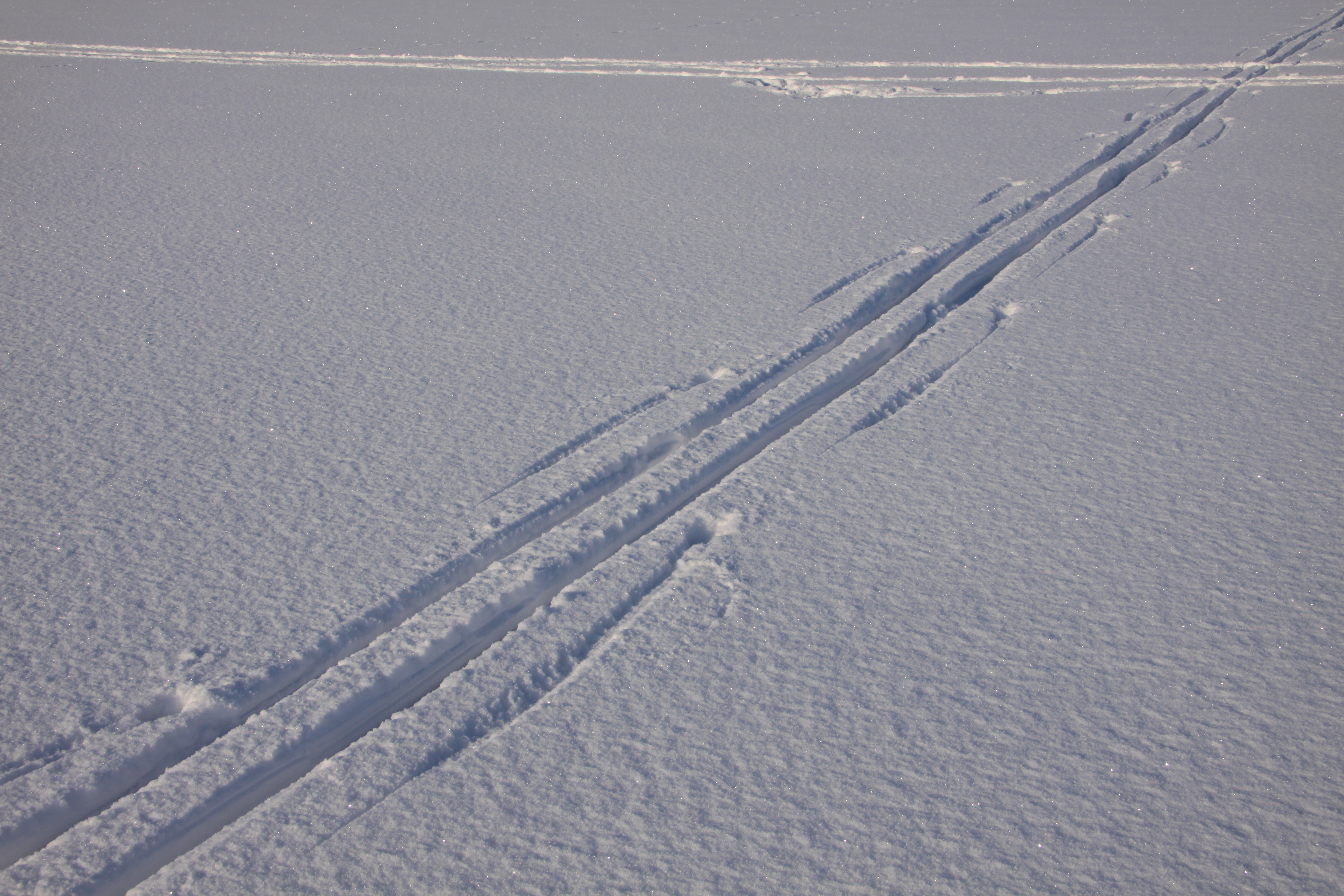 Quelle merveille, tout est cristallisé. Ce silence et ce bruissement de la neige. Quelques flocons tombent avec délicatesse lorsqu’un brin d’air les fait chavirer vers nous. Le bruit des skis et des patins, de loin, sur la glace/neige comme des vagues qui ne sont pas… Chaque cristaux de glace brillent et vous illuminent. Chaque trace vous fait imaginer un animal qui a peut-être traversé le lac à l’orée du jour, ou un dessin géométrique sur une surface lisse et infinie. J’essaie au mieux de décrire toutes ces émotions que furent les miennes pendant 3 heures de balades et 351 photos, 42Go plus tard…
