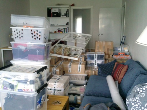 Même si le déménageur empaquètera la plupart de nos affaires, pour ma plus grande joie de ne pas entendre le scruuuuutch du rouleau de scotch… nous avons tout de même rassemblé certaines de nos affaires au même endroit voire dans des cartons de papier A4. (Ces derniers étant moins lourds, je les avaient rapportés petit à petit du boulot, ne sachant pas non plus comment nous allions gérer le déménagement)