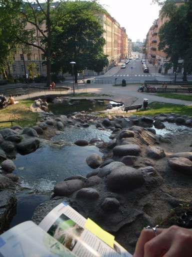 C’était le Tégnerlunden… mouais… La photo essaie de montrer la vue du guide, et … la vrai. Bon c’est pas si nul que ça, ok. Mais mes espoirs de me cocooner dans les bras de mon homme dans ce parc verdoyant, sont un peu tombés à l’eau… (surtout avec ce filet d’eau ridiculos ! ) ça a beaucoup fait rire Gurvan ! :p