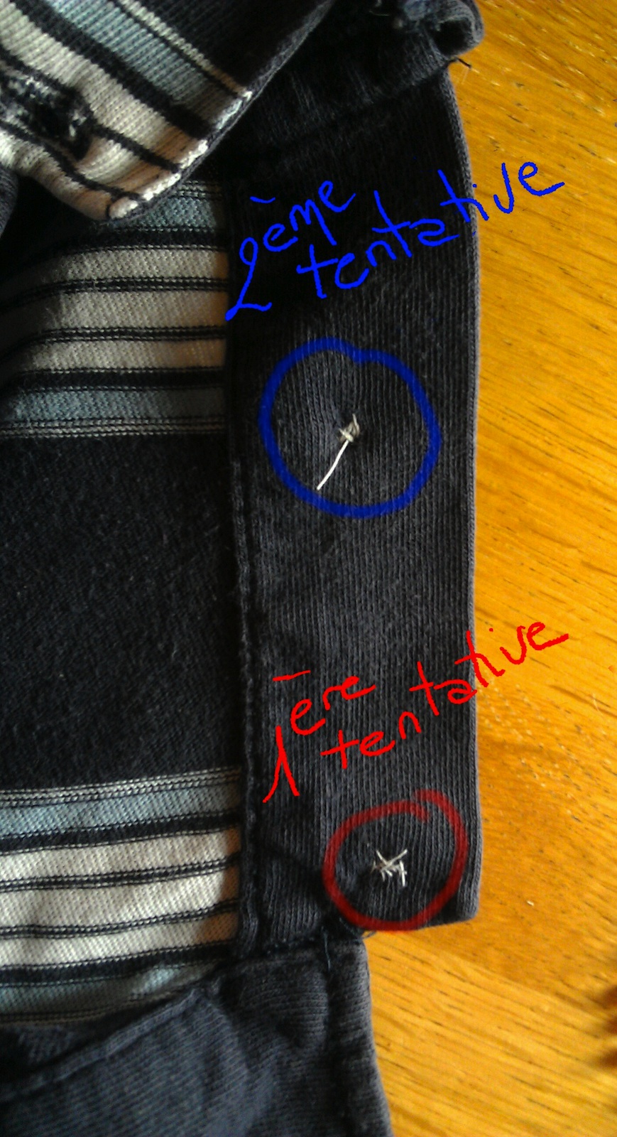 J’ai enfin cousu les boutons de ce T-shirt… Lors de mon 1er essai, je me suis rendue compte, à la fin et en retournant mon tissu, qu’il y avait aussi un envers et qu’il serait judicieux d’en tenir compte. Mon 2ème essai montre une petite amélioration, mais c’est pas encore ça…