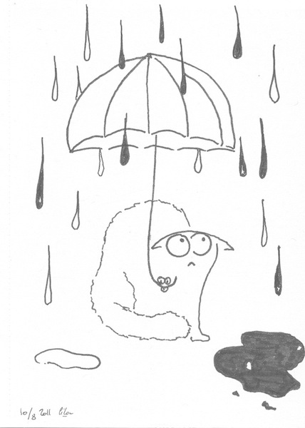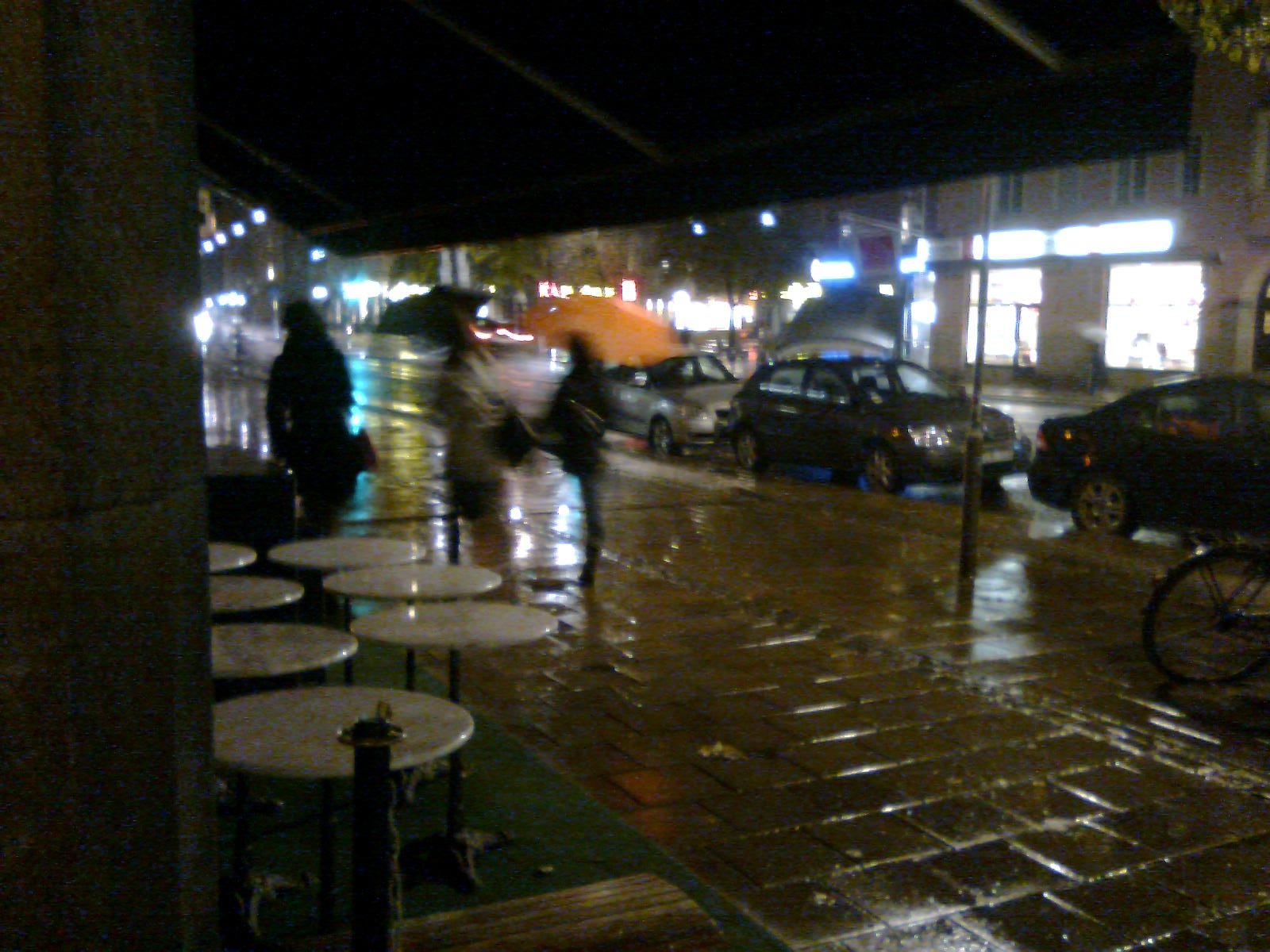 Depuis notre porche, une vue sur un soir pluvieux à Stockholm. Petit détail hautement intéressant, juste au dessus du parapluie orange, on peut distinguer, si on est vraiment balaise, l’enseigne de notre ICA de quartier.