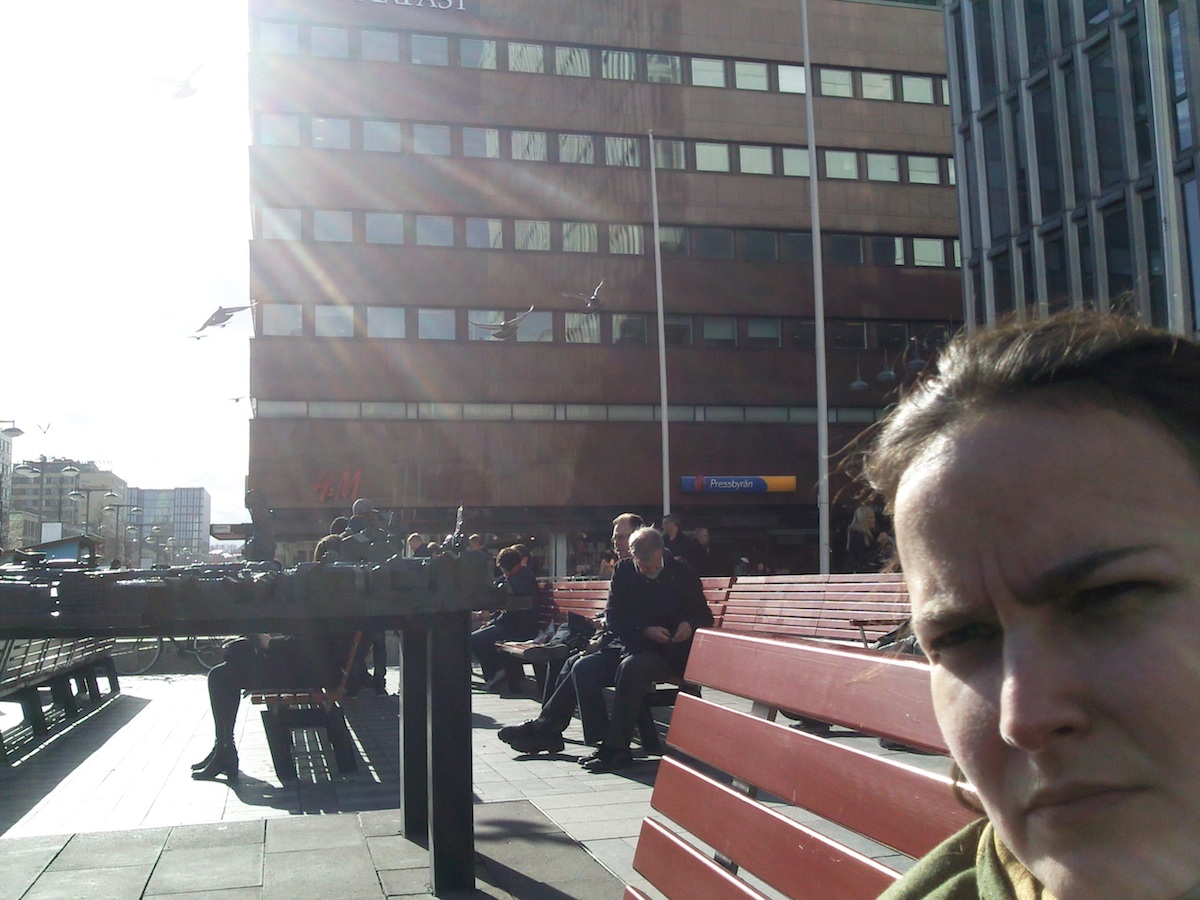 Il y a un an, nous nous étions demandé pourquoi ils avaient mis tous ces bancs alignés sur cette place centrale de Stockholm. Cela paraissait très curieux, et je me souviens m’être fait la remarque critique : « Pfff c’est ridicule, je vois pas pourquoi je me poserai parmi tout ces gens entre tous ces bancs!« . Mais aujourd’hui, j’ai compris! Après l’hiver, on a qu’une envie c’est de se poser sous un rayon de soleil et d’en profiter. Hors cette grande place entourée de building n’a pas de terrasse au soleil où l’on pourrait boire un verre. Et là , sur cette place, c’est le seul endroit où le soleil passe pour réchauffer nos carcasses d’hiver…