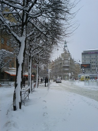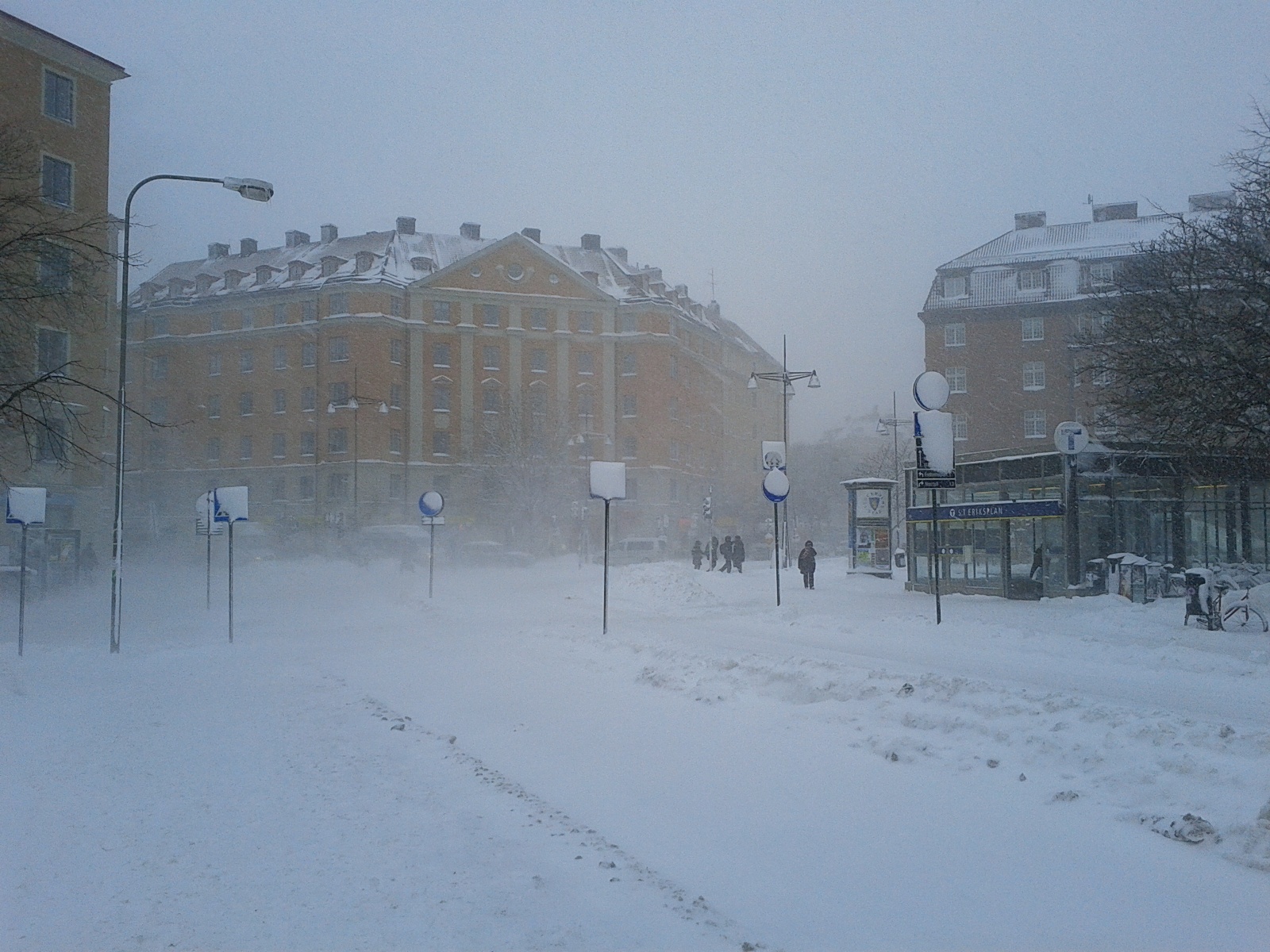 À midi, la neige ne tombe plus mais Stockholm revêt toujours sont beau manteau blanc.