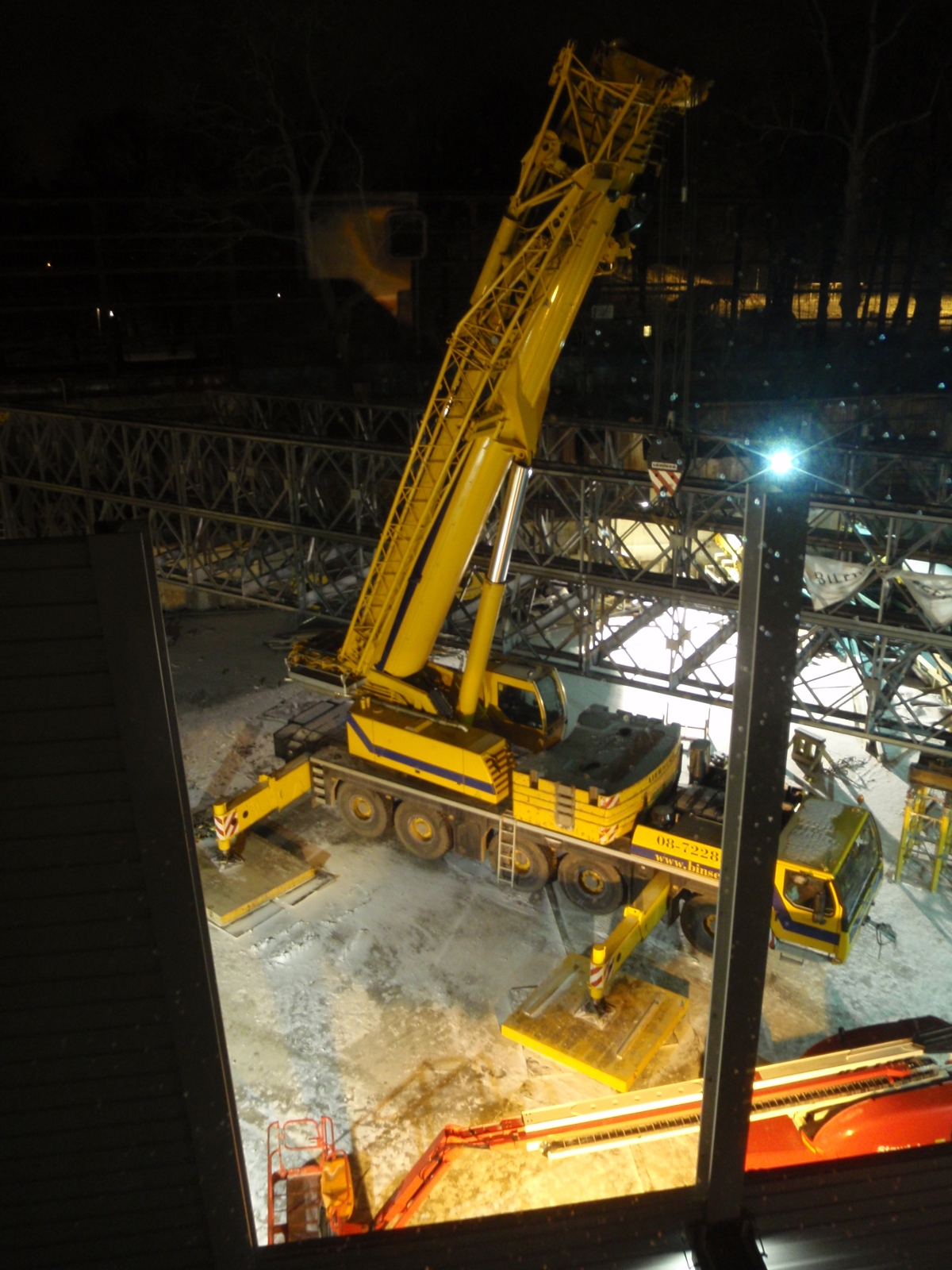 Les ouvriers du chantier derrière chez nous ont partiellement démonté le mur antibruit juste devant notre appartement. On a maintenant une belle vue sur leur énorme grue mobile.